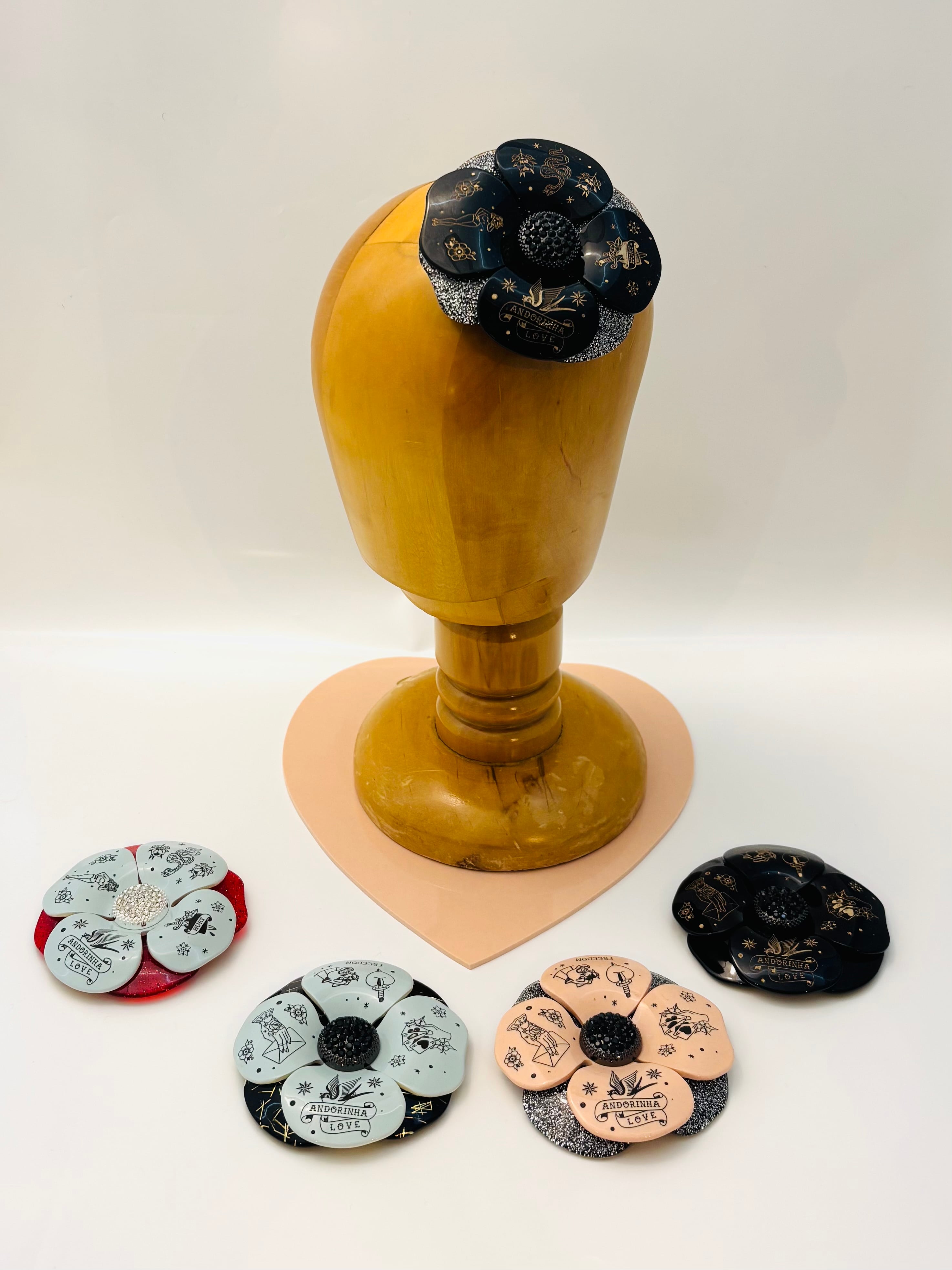 大きなカメリアのブローチです。柄は彫刻で、色を塗って柄が表現されています。